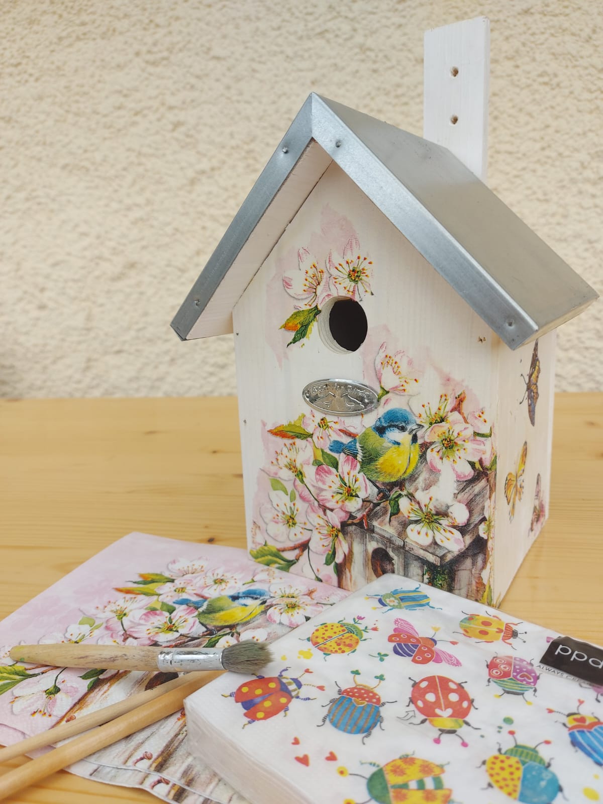 Hölzerne Vogelnistkästen werden mit lustigen und abwechslungsreichen Serviettenmotiven verziert und erstrahlen in neuem Glanz. Gestalte deinen eigenen Nistkasten mit Serviettentechnik und freue dich darauf, wenn schon bald die ersten gefiederten Besucher ein neues Zuhause darin finden.