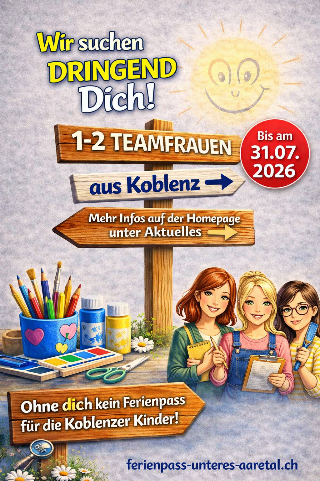 Leider gilt: Wenn wir bis zum 31.07.2026 niemanden finden, können die Kinder aus Koblenz nicht mehr am Ferienpass Unteres Aaretal teilnehmen.
