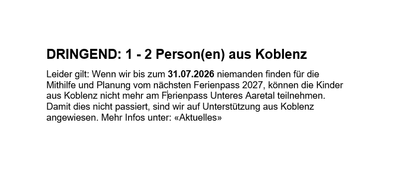 Startseite Fotoalben Fotoalben Koblenz 31.03.2026 Ferienpass 2026 07.01.2026 bald findet der Ferienpass 2026 während den Frühlingsferien statt. Impressionen 12.09.2024